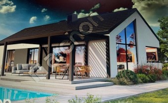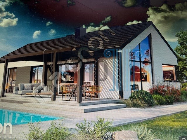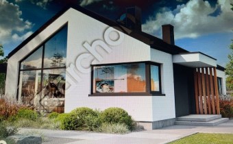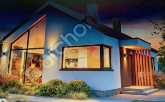 Wyjątkowy projekt domu parterowego z panoramicznymi przeszkleniami, dodającymi bryle lekkości wizualnej. Kompozycja elewacyjna doskonale odzwierciedla nowoczesny design, prezentując białe i szare tynki z akcentami drewnianej okładziny oraz grafitowej stolarki. Zwieńczeniem budynku jest bezokapowy dach dwuspadowy w kolorze antracytu, a od strony ogrodu znajduje się przytulna strefa tarasowa pod ażurową pergolą. Główne wejście zaplanowano pod betonowym zadaszeniem, które ochroni tę część przed zmienną pogodą. Wnętrze domu to wyraźny i funkcjonalny układ łączący dzienną oraz nocną strefę. Nad salonem z narożnikiem oraz jadalnia oferującą duży stół, otwarto strop do połaci dachowej, co pozwoli rodzinie cieszyć się większą przestrzenią. Kuchnia wzbogacona o wyspę z siedziskami obejmuje również przylegającą, praktyczną spiżarnię. Część wspólną wieczorami oświetli efektowny kominek, dodając przestrzeni przytulnego klimatu. Długi korytarz prowadzi do gościnnej toalety oraz kotłowni z pralnią. Dalej, zaprojektowano prywatną część domu, w której mieści się sypialnia rodziców z garderobą oraz dwa wygodne pokoje dla dzieci. Z pomieszczeń zlokalizowanych od strony ogrodu, można swobodnie wyjść na atrakcyjny taras. Do wspólnego użytku domowników pozostaje łazienka z wanną i prysznicem.