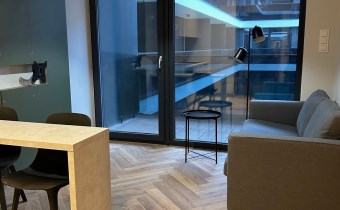 Z salonu i z sypialni mają Państwo wyjście przez nowoczesne, rozsuwane szyby balkonowe na piękny duży taras, z miejscem na meble wypoczynkowe i rośliny.